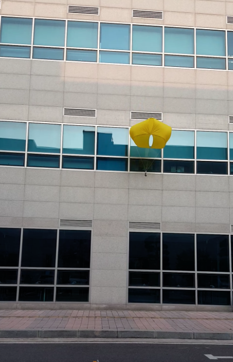 Terminal Velocity : 2.44m/s. This cross parachute was designed by Kim, Jinho.
